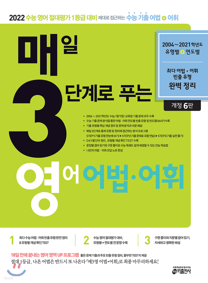 2004~2021학년도 “유형별+연도별”로 구성된 수능 영어 어법·어휘의 교과서 『매3영 어법·어휘』 문항 수는 적지만 고난도 유형의 하나인 어법·어휘는 등급을 결정짓는 절대적인 요소이며 어법·어휘 문항들을 맞추지 못하면 1등급에 절대 다가갈 수 없다. 수능에서는 전혀 새롭거나 기존에 다루어지지 않은 문법 사항이 출제되는 경우는 거의 없으므로, 기출 어법 사항들을 중심으로 공부하는 것이 좋다. “기출유형 확인 → 기출유형 연습 → 수능 기출 실전 풀기”로 완벽 정리된 『매3영 어법·어휘』로 18일 만에 수능 어법·어휘를 완성하자! |