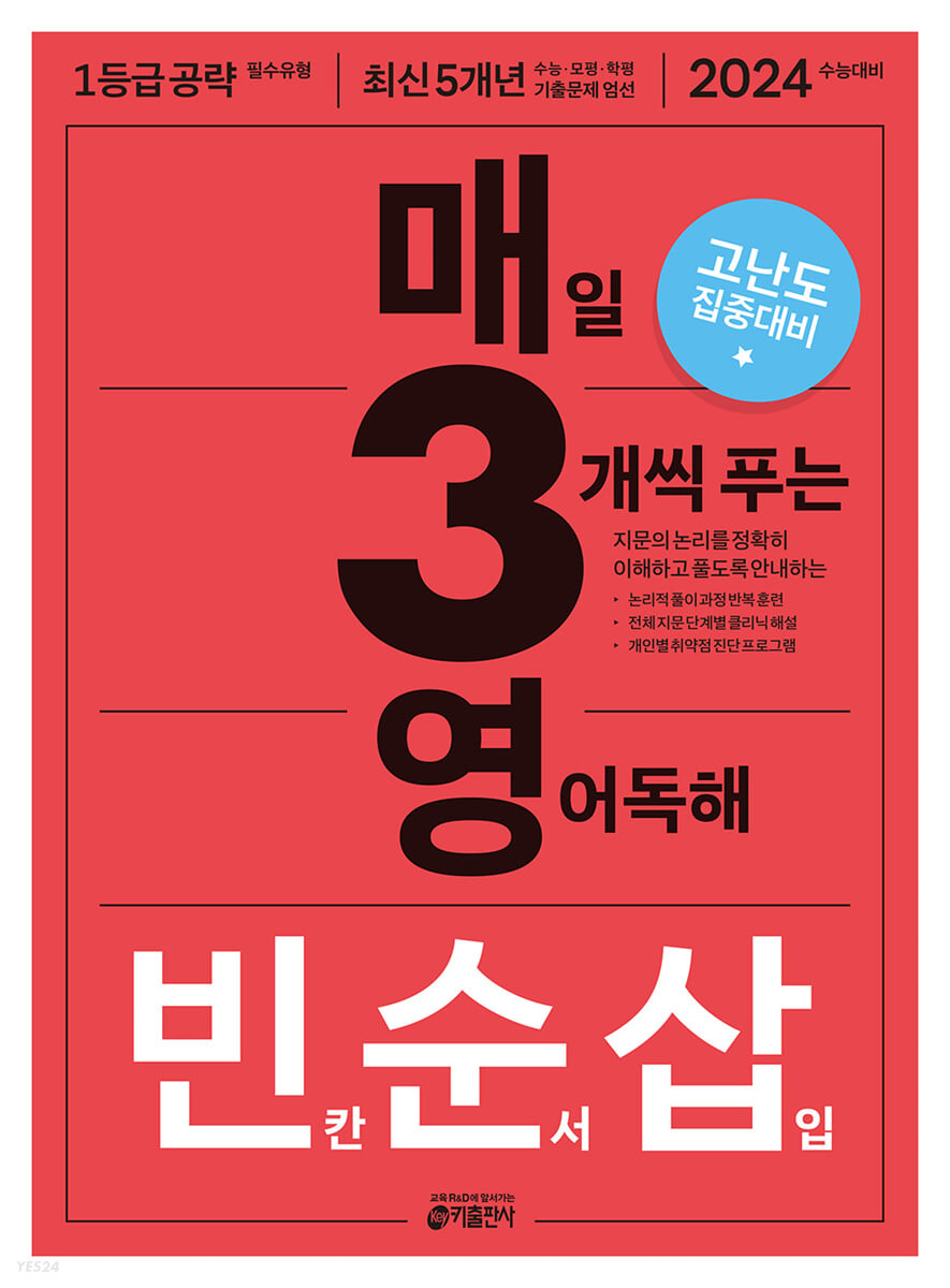 수능 영어 1등급 필수템 정답으로 가는 논리적 사고 과정 전.격.해.부 [매3영 빈순삽]으로 고난도 유형 정복하고 수능 영어 1등급 받자! 수능 영어 고득점의 주요 관문은 ‘빈칸, 순서, 삽입’입니다. 최근 빈칸 유형만큼이나 순서, 삽입에서도 킬러 문제들이 다수 출제되고 있습니다. 이제는 ‘빈칸, 순서, 삽입’ 유형을 얼마나 맞혔는지에 따라 중위권과 상위권이 갈리고, 1등급과 2등급이 갈립니다. 그래서 [매3영 빈순삽]을 준비했습니다. 출제 경향성에 맞춘 최신 5개년 기출 문제로 엄선 빈순삽 유형의 최신 경향을 반영하여 5개년 수능, 모의평가, 학력평가에서 대표적인 문제들로 엄선하였습니다. 엄선한 문제들을 유형별 세부 케이스별로 분류하여 효과적으로 학습할 수 있습니다. 연습이 실전까지 이어지는 ‘공통 풀이 과정’ 반복 훈련 일부 문제에만 적용되는 지엽적인 풀이 전략을 지양하고, 어느 문제든 적용이 가능한 ‘공통 풀이 과정’을 제시합니다. 매일매일 같은 풀이 과정을 연습하다 보면, 연습이 자연스럽게 실전으로까지 연결됩니다. 답에 끼워 맞춘 결과론적 해설은 NO, 지문 그 자체에서 출발하는 단계적 해설 [매3영 빈순삽]은 답을 알아야 이해할 수 있는 결과론적 해설을 지양합니다. 문제와 지문 그 자체에서 출발하여, 어떤 풀이 과정을 통해 답을 도출할 수 있는지 그 과정을 단계적으로 안내합니다. 전체 문항을 상세하게 해설하는 진짜 클리닉 해설 [매3영 빈순삽]은 교재에 수록된 모든 문제를 대표 예제만큼 자세하고 꼼꼼하게 해설합니다. 풀이 과정에 따라 자세히 서술한 ‘클리닉 해설’을 통해, 자신의 풀이 과정이 적절했는지 되돌아보고 나의 취약점도 진단하고 보완할 수 있습니다. |