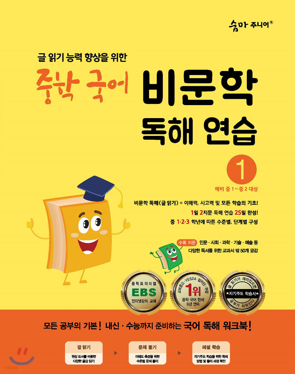 중학 국어 비문학 부문 베스트셀러 문제집! 이해력, 사고력 및 모든 학습의 기초를 탄탄하게! 지문, 선지 분석 훈련으로 글 읽기 능력 향상!! 1. 인문, 사회, 과학, 기술, 예술 등의 다양한 제재에서 글 읽기 2. 4가지 사고 유형(사실적, 추론적, 비판적, 창의적) 훈련가능 3. 문제와 해설을 중학생의 어휘수준으로 구성하여 자기주도학습 가능 4. 독해의 기초 Tip을 통한 내신 국어에서 수능 국어까지 대비 가능한 독해 테크닉 제공 5. 제재별로 자주 나오는 어휘의 정리와 TEST를 통한 어휘 능력 향상 6. 모든 지문과 문제가 분석된 SUB NOTE 제공 - 대상 : 중학교 1학년 - 구성 : 이론 + 문제 |