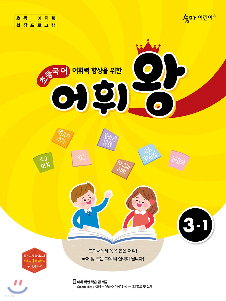 『초등국어 어휘왕』은 초등 어휘력 확장프로그램으로 교과서에서 뽑은 어휘를 수록한 교재이다. 새롭고 낯선 어휘와 기초 맞춤법, 띄어쓰기 및 원고지 쓰기, 표준 발음법, 기초적인 문법 지식을 공부하며 학습한 어휘들을 다시 한 번 확인하여 어휘력을 높인다.