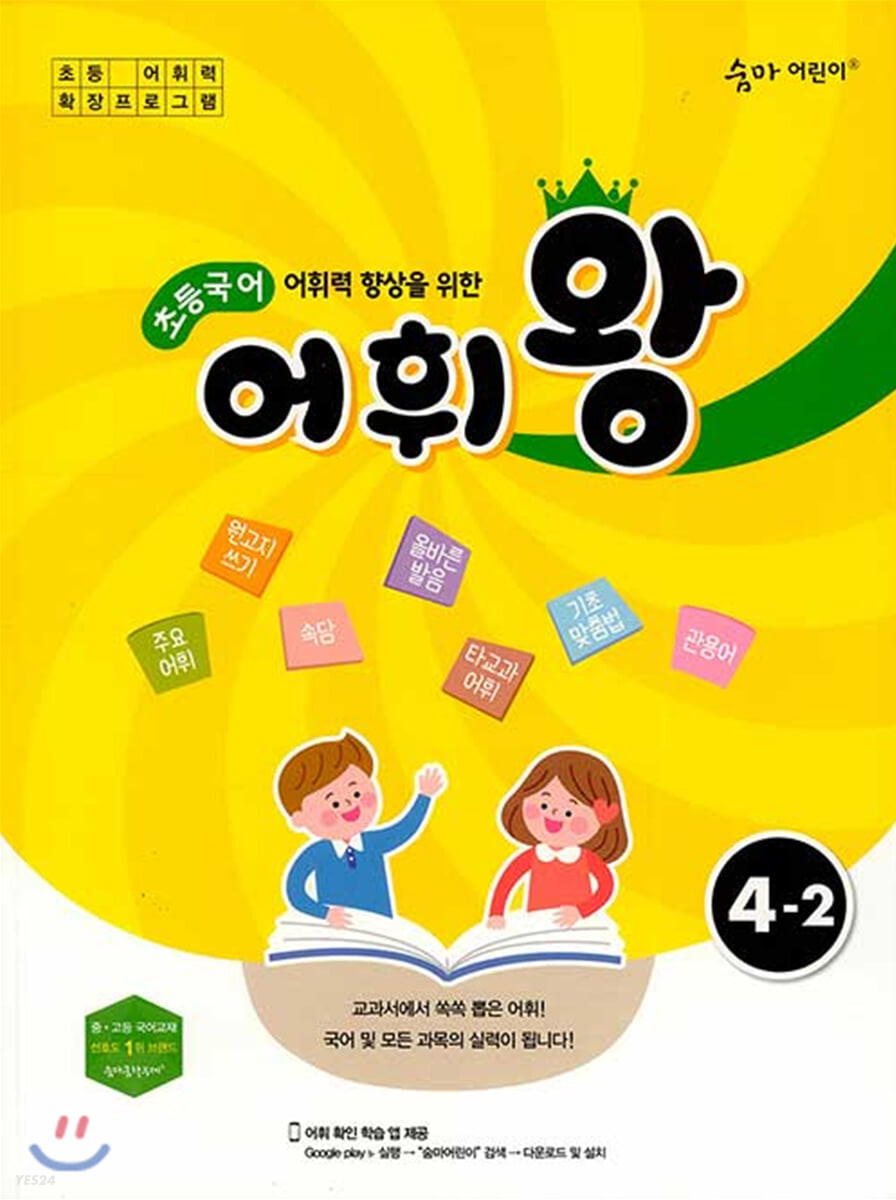『초등국어 어휘왕』은 초등 어휘력 확장프로그램으로 교과서에서 뽑은 어휘를 수록한 교재이다. 새롭고 낯선 어휘와 기초 맞춤법, 띄어쓰기 및 원고지 쓰기, 표준 발음법, 기초적인 문법 지식을 공부하며 학습한 어휘들을 다시 한 번 확인하여 어휘력을 높인다.