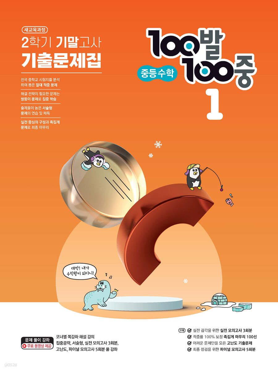 최근 3년간 전국 중학교 기출문제를 분석하여 출제 경향과 출제율을 기반으로 한 실전 중심의 교재이다. 출제율이 높은 기출 Best 문제와 과제용 기출 Best 쌍둥이 문제, 학생들이 쉽게 따라서 쓸 수 있도록 서술형을 쌍둥이 문제로 제공하고, 조건이나 형태가 바뀌어서 출제되어 해결방법이 쉽지 않은 유형의 문제를 별도로 선별하여 구성한 집중공략 코너에서는 손쉬운 해결전략을 제시한다. 100발100중 중등수학 기출문제집의 큰 장점으로 알려진 특별부록에서는 실전 감각을 점검할 수 있는 실전 모의고사 3회분, 시험에 반드시 나오는 문제로 구성된 족집게 마무리 100선(객관식 80선, 서술형 20선), 수학 만점자를 가리기 위해 출제되는 고난도 기출문제, 마지막으로 시험 직전 최종 점검을 할 수 있는 파이널 모의고사 5회분을 제공한다. 또한, 100발100중 홈페이지 http://www.100bal.com에서 문제풀이 동영상 강좌를 무료로 제공하고 있다.