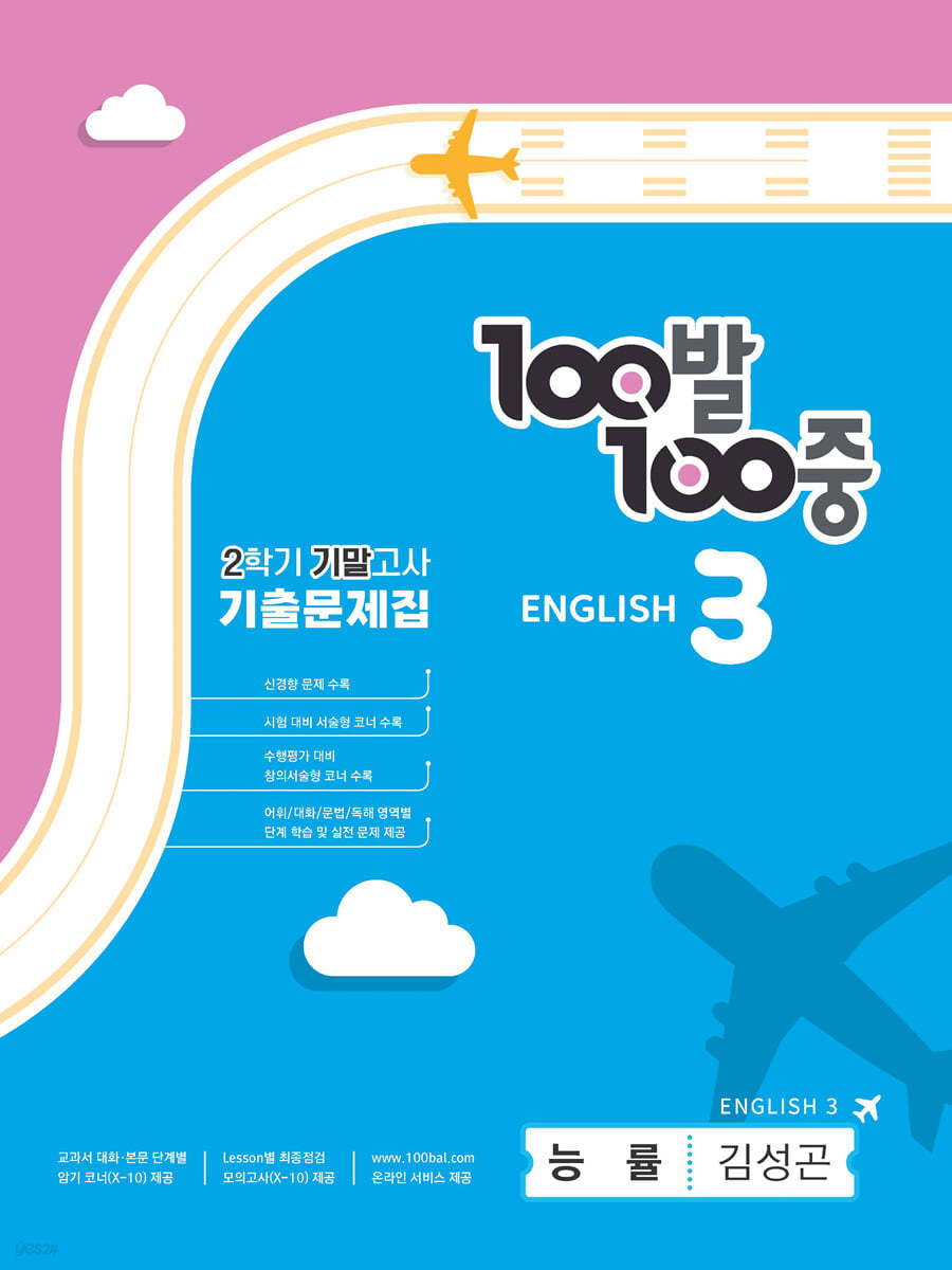 최근 3년간 전국 중학교 기출문제를 분석하여 출제 경향과 출제율을 기반으로 한 실전 중심의 교재이다. 출제율이 높은 기출 Best 문제와 과제용 기출 Best 쌍둥이 문제, 학생들이 쉽게 따라서 쓸 수 있도록 서술형을 쌍둥이 문제로 제공하고, 조건이나 형태가 바뀌어서 출제되어 해결방법이 쉽지 않은 유형의 문제를 별도로 선별하여 구성한 집중공략 코너에서는 손쉬운 해결전략을 제시한다. 100발100중 중등수학 기출문제집의 큰 장점으로 알려진 특별부록에서는 실전 감각을 점검할 수 있는 실전 모의고사 3회분, 시험에 반드시 나오는 문제로 구성된 족집게 마무리 100선(객관식 80선, 서술형 20선), 수학 만점자를 가리기 위해 출제되는 고난도 기출문제, 마지막으로 시험 직전 최종 점검을 할 수 있는 파이널 모의고사 5회분을 제공한다. 또한, 100발100중 홈페이지 http://www.100bal.com에서 문제풀이 동영상 강좌를 무료로 제공하고 있다.