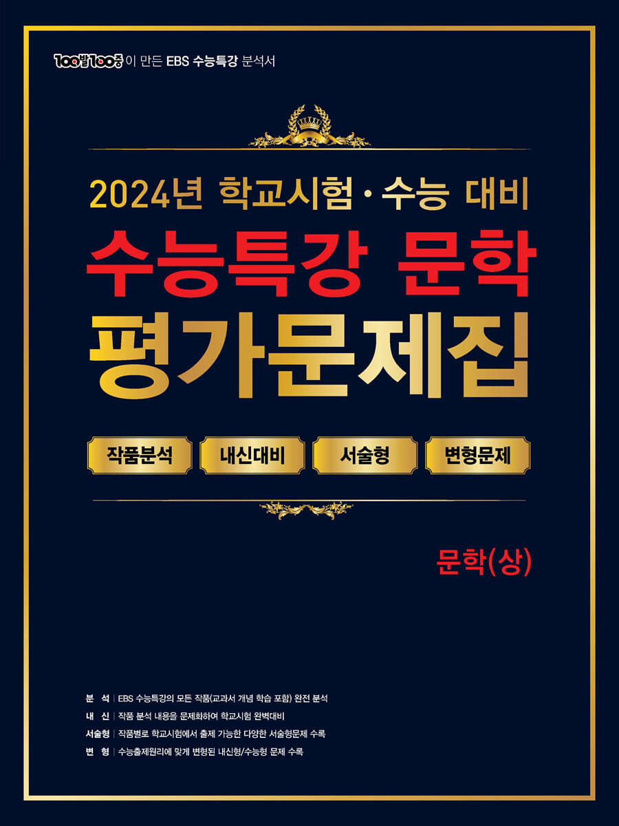 수능 국어의 연계 교재로 활용되고 있는 『EBS 수능특강-문학』에 수록된 작품을 체계적이고 온전하게 학습하기 위한 평가문제집이다. 교과서 개념 학습에서부터 실전 학습에 이르기까지 『EBS 수능특강-문학』에 수록된 모든 작품을 자습서 이상으로 상세히 분석하였고, 내신과 수능에 꼭 나오는 출제 포인트를 단계별로 학습하도록 해 학생들이 내신과 수능 모두에 대비할 수 있도록 했다. 문학(상)은 교과서 개념 학습, 고전 시가, 현대시, 고전 산문으로 구성되었고, 문학(하)는 현대 소설, 극수필, 갈래 복합, 실전 학습으로 구성되었다.