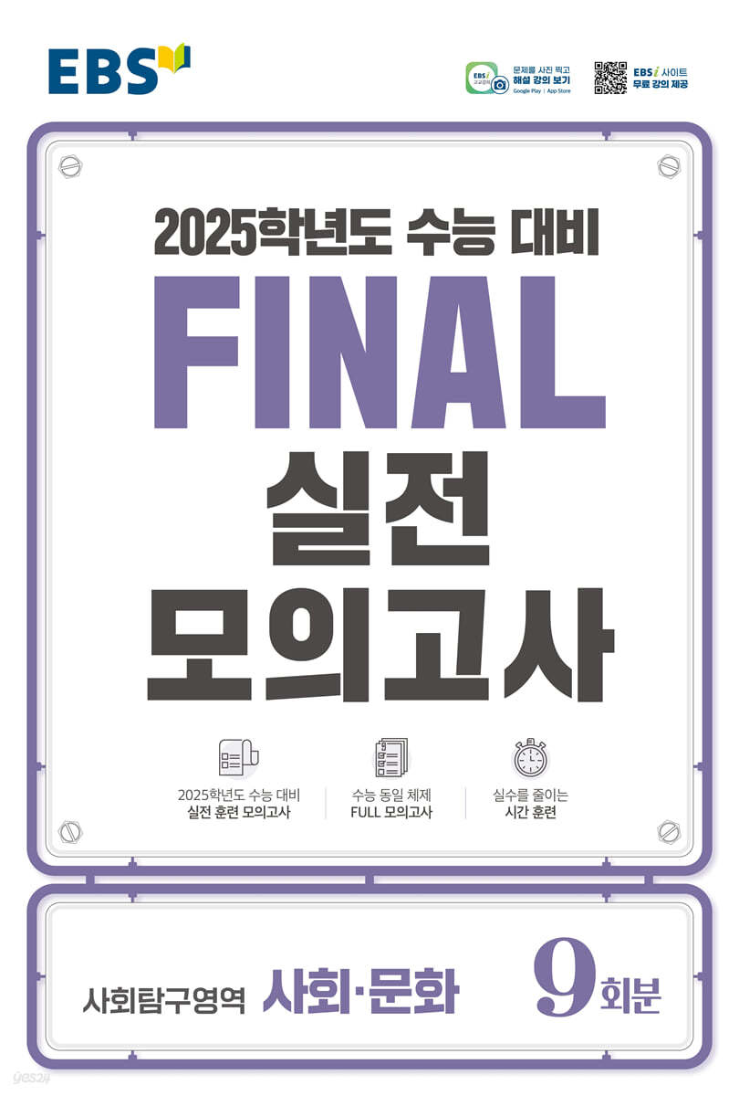 2025학년도 수능 대비 가장 먼저 출시되는 모의고사로 6월 모의평가부터 대비할 수 있다. 과목별 7~9회분으로 충분한 연습 분량을 제공하며 출제 가능성이 높은 문항을 실제 수능 유형과 난이도에 맞게 수록하였다. ‘EBSi’에서 제공하는 100% 무료 강의를 인터넷 사이트 / 스마트폰 ‘EBSi 고교강의’ 앱을 통해 들을 수 있다.