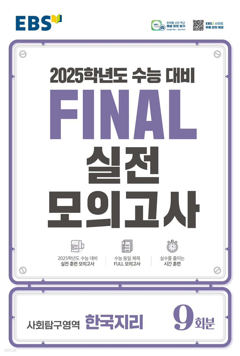 2025학년도 수능 대비 가장 먼저 출시되는 모의고사로 6월 모의평가부터 대비할 수 있다. 과목별 7~9회분으로 충분한 연습 분량을 제공하며 출제 가능성이 높은 문항을 실제 수능 유형과 난이도에 맞게 수록하였다. ‘EBSi’에서 제공하는 100% 무료 강의를 인터넷 사이트 / 스마트폰 ‘EBSi 고교강의’ 앱을 통해 들을 수 있다.