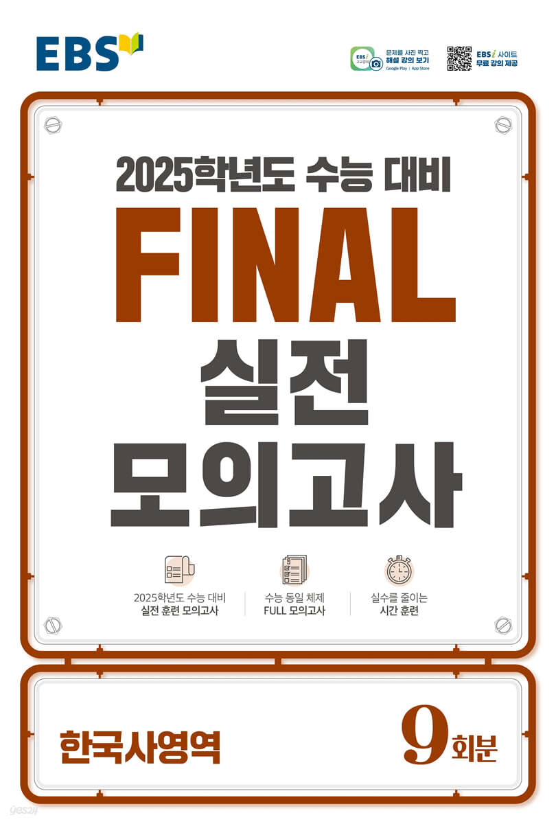 2025학년도 수능 대비 가장 먼저 출시되는 모의고사로 6월 모의평가부터 대비할 수 있다. 과목별 7~9회분으로 충분한 연습 분량을 제공하며 출제 가능성이 높은 문항을 실제 수능 유형과 난이도에 맞게 수록하였다. ‘EBSi’에서 제공하는 100% 무료 강의를 인터넷 사이트 / 스마트폰 ‘EBSi 고교강의’ 앱을 통해 들을 수 있다.