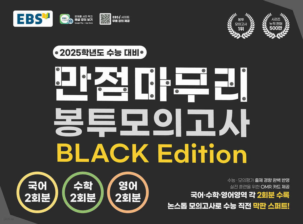 국어·수학·영어 영역 합본 구성의 논스톱 모의고사로 수능 직전 막판 스퍼트 올리자! EBS 만점마무리 봉투모의고사 BLACK Edition은 6월 모의평가와 수능 출제 경향을 완벽 반영하여 수능 직전 실전 감각을 더욱 높일 수 있다. 만점마무리 봉투모의고사 이후, 영역별 고민 문항 해결 및 주요 영역을 보다 효율적으로 마무리할 수 있다. 연습도 실전처럼! 셀프 모의고사 용도로 활용 가능한 OMR 카드를 제공한다. 인터넷 사이트와 스마트폰 ‘EBSi 고교강의’ 앱을 통해 100% 무료 강의를 들을 수 있다.