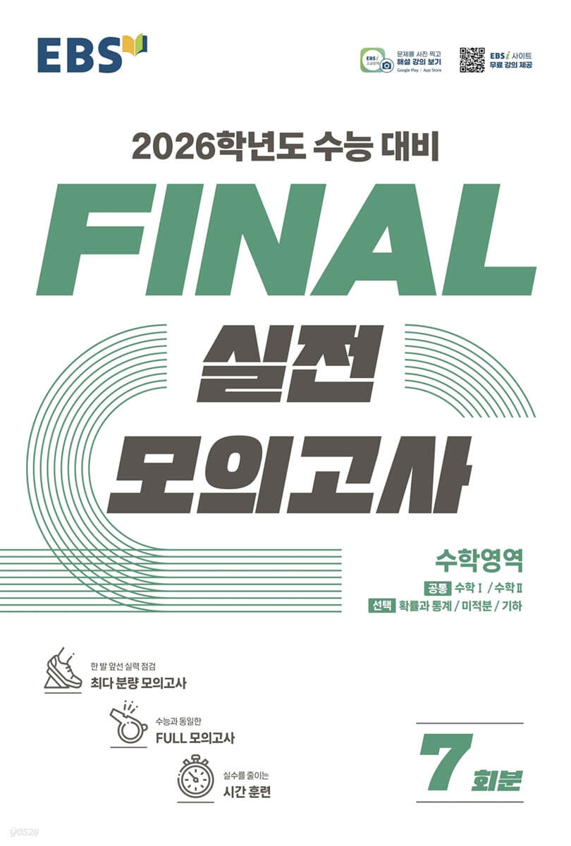 『FINAL 실전모의고사』는 2026학년도 수능 체제에 맞춘 문항 구성으로 실제 수능과 가장 가깝게 실전 감각을 키울 수 있다. 최다 분량 7회분의 FULL 모의고사로 6월 모의고사 전 내 실력을 점검하고 실수를 줄일 수 있다. ‘EBSi’에서 100% 무료 강의 제공! 인터넷 사이트와 스마트폰 ‘EBSi 고교강의’ 앱을 통해 무료 강의를 들을 수 있다.