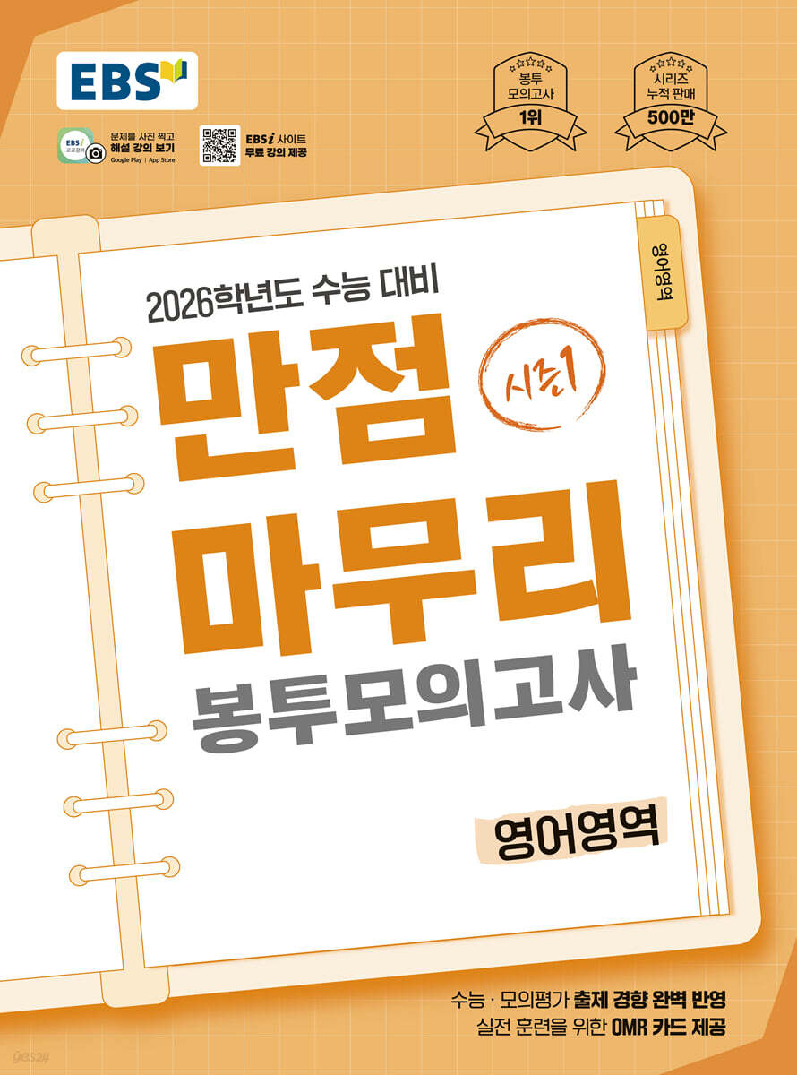 실제 수능과 동일한 체제와 난도의 문항을 담은 'EBS 만점마무리 봉투모의고사 시즌1'과 함께 수능 실전 감각 UP! 수능·모의평가의 최신 출제 경향을 완벽 반영하여 9월 모의평가와 수능 대비 단기 실전 학습을 할 수 있다. 실제 시험처럼 답안 작성 훈련을 하며 실전 감각을 키울 수 있는 OMR 카드가 동봉되어 있다. ‘EBSi’에서 100% 무료 강의 제공! 인터넷 사이트와 스마트폰 ‘EBSi 고교강의’ 앱을 통해 들을 수 있다.
